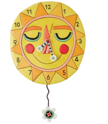 Bring serenity and sunshine to your space with the Blooming Bright wall clock by Allen Designs, featuring a peaceful, smiling sun with closed eyes. Complete with flower-shaped clock hands and pendulum, the radiant design inspires tranquility all day.