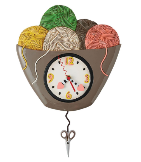 Celebrate creativity with the Loose Ends wall clock by Allen Designs, shaped as a bowl brimming with colorful yarn balls. Featuring a playful scissor pendulum, this clock ticks away with inspiration, reminding you it's always time to craft!