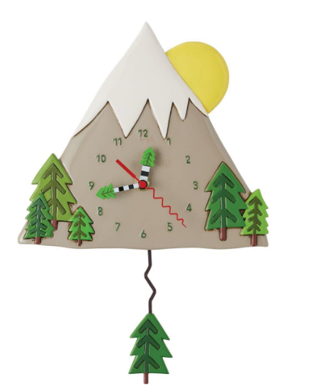 Embrace the call of the wild with the Peak Time wall clock by Allen Designs, showcasing the sun rising behind a majestic mountain. With trees adorning the mountainside and a tree pendulum swaying below, it's time for adventure.