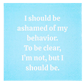 "I should be ashamed of my behavior. To be clear, I'm not, but I should be.", cocktail napkin is perfect for your next girls’ night or cocktail party! This Carolina blue and white cocktail napkin is a fun addition to any party or luncheon! Both men and women love this fun saying!