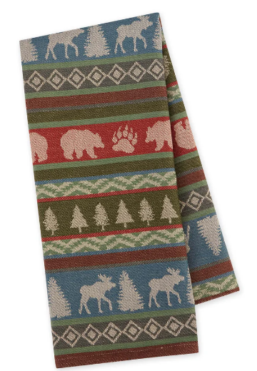 Jacquard dishtowel is finished with a hanging loop in corner