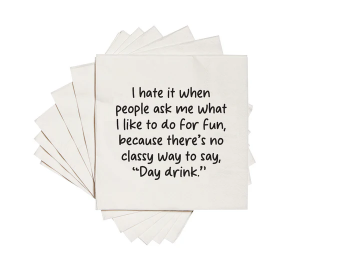 Our 3-ply, 5x5 folded, white napkins are printed with crisp black ink. They come cellophane wrapped in packs of 20, and we think they're some of the funniest on the market! (If we do say ourselves.)