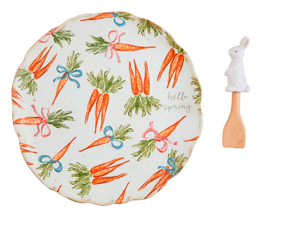 2-piece set. Hand-painted stoneware platter. Comes with wooden spatula with bunny handle.