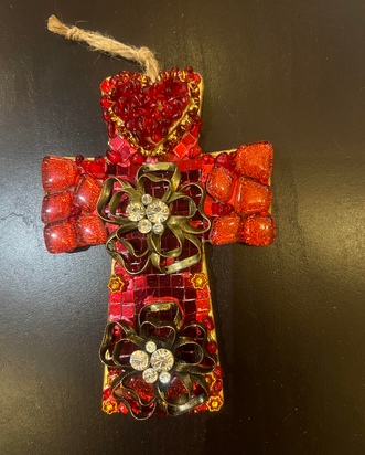 Exquisite, one of a kind cross created on a metal base! Each cross is signed by the artist Julie Wishmeyer. This would add a touch of flair to any wall décor from contemporary to western!