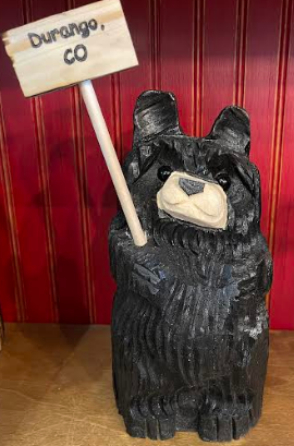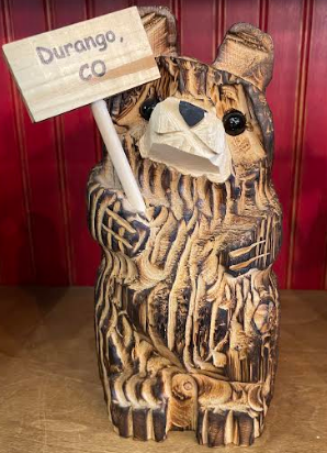 Standing rustic carved bear holding "Durango Colorado Sign"