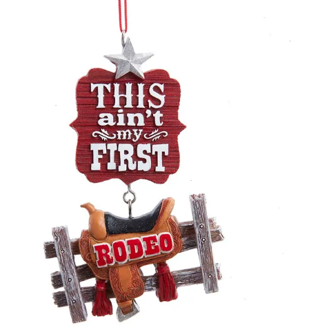 "This Ain't My First Rodeo" ornament is a festive addition to your holiday décor or Christmas tree. It features a saddle atop a wood fence and a silver glitter star.