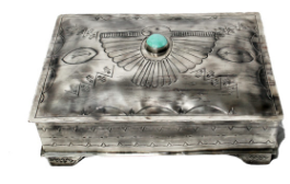 This J. Alexander Silver Box is crafted by hand from nickel silver and features a Thunderbird on its lid with a turquoise stone in the center. Put it next to your bed or on your dresser or on your coffee table; it’ll look great wherever it lives.