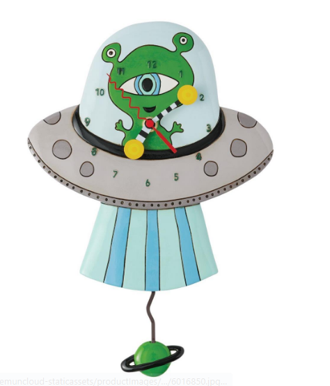 Bring a touch of cosmic charm to your space with this Alien Flying Saucer Wall Clock by Allen Designs. Featuring a vibrant alien piloting a UFO and a miniature planet swinging as the pendulum, this playful traveler timepiece is out of this world!